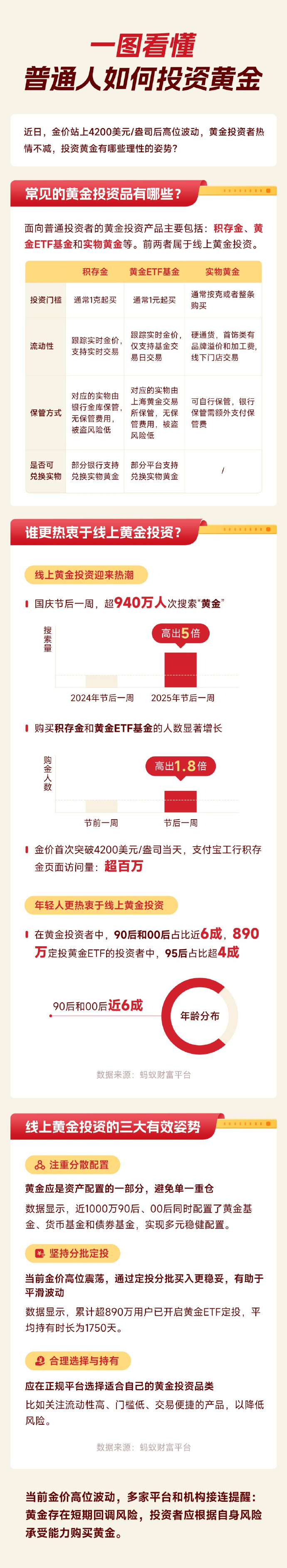 近日,金价站上4300美元后高位震荡,但投资者热情不减。数据显示,国庆节后线上黄金投资迎来热潮,节后一周购买积存金和黄金ETF基金的人数是节前同期的1.8倍。同时,年轻人成线上黄金投资主力,90后、00后占比近6成。业内人士提示,当前金价高位波动,短期有回调风险,应将黄金作为资产配置的一部分,避免单一重仓。分散配置、坚持定投和合理持有才是有效姿势。数据显示,近千万90后、00后同时配置了黄金、货币基金和债券基金,被网友称作“新三金”。